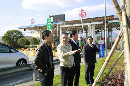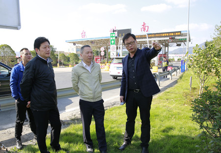 圖為集團(tuán)副董事長(zhǎng)、總經(jīng)理張建平在臺(tái)州南收費(fèi)所主站考察協(xié)調(diào)院橋互通綠化、養(yǎng)護(hù)等工作