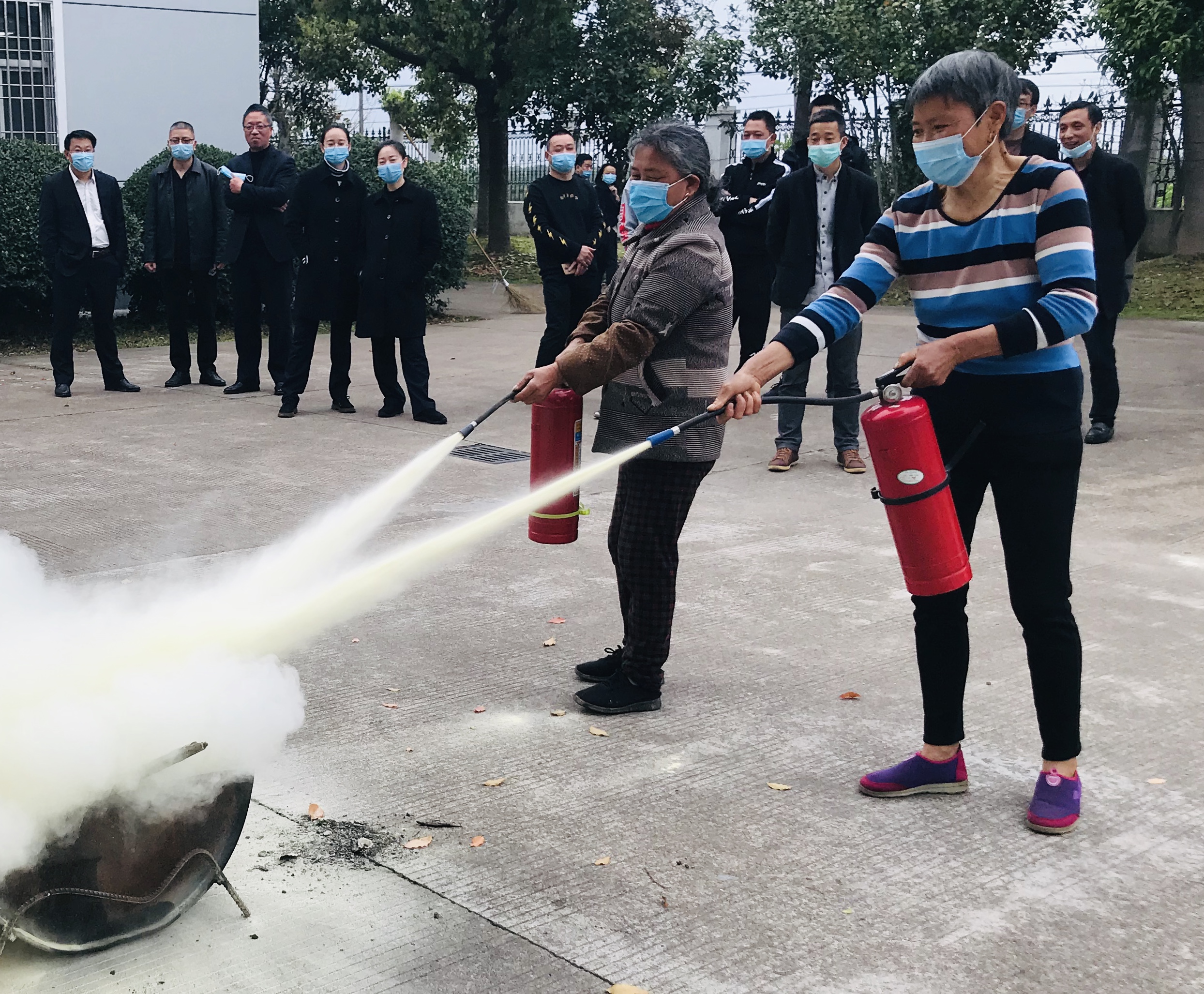 圖為使用滅火器演練 隨后,該所開展滅火器使用模擬演練。在演練中,大家利用平時更換下來的舊滅火器,依次輪流進行操作,更有一些員工主動熱心幫助保潔阿姨們講解如何正確使用滅火器,以身示范正確操作方式及每一個分解動作要領。