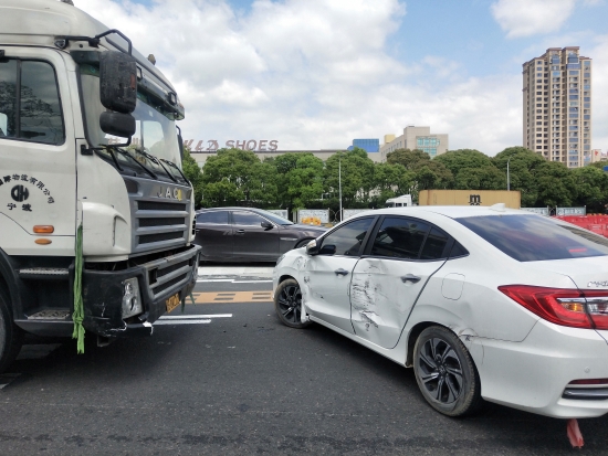 圖為事故現(xiàn)場 聽到巨響,收費(fèi)員立即上前查看,所幸兩車司機(jī)都安好,便立即開啟備用車道,以保證其他車輛通行順暢,并且在事故車輛后方放上小紅帽,告知后方來車及時(shí)駛?cè)肫渌嚨馈6鴥绍囁緳C(jī)快速撥打交警電話,并且拍照留證,以最快的速度駛出收費(fèi)站靠邊等待交警處理。 經(jīng)調(diào)取錄像,查看事故緣由。“真相”竟是集裝箱司機(jī)引發(fā)的,該車從杭州寧波方向過來,小轎車司機(jī)從溫州方向匝道駛出,由于集裝箱司機(jī)下橋時(shí)沒有注意右方來車,只顧自己右拐車道,直接頂著轎車開出50多米,所幸未造成人員傷亡。 在此小編提醒大家:在駛?cè)朐训赖臅r(shí)候,司機(jī)要減速行駛;在選擇出口車道的時(shí)候,要仔細(xì)查看前后方和左右來車,且不要突然變更車道,否則容易造成車輛之間的親密“接觸”。 只有文明安全行駛,才是對(duì)自己和他人最好的保護(hù)。 鄭霞霞