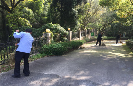 圖為執(zhí)勤隊員打掃落葉