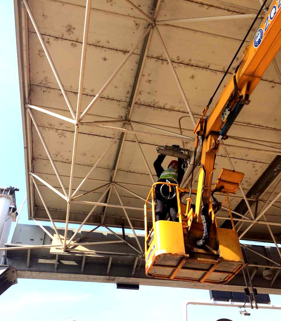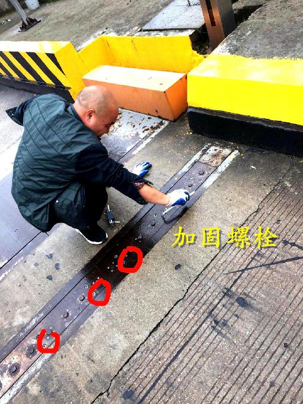 圖為隊(duì)員正在更換車道頂棚燈 期間在臺(tái)州南收費(fèi)所發(fā)現(xiàn)有兩個(gè)車道出現(xiàn)異常,即當(dāng)重型車輛通過時(shí),輪檢鐵板和稱臺(tái)出現(xiàn)不正常晃動(dòng)情況。根據(jù)以往經(jīng)驗(yàn),此情況如不進(jìn)行及時(shí)維修,對車輛計(jì)重將造成嚴(yán)重影響。對此,技術(shù)人員不僅對鐵板上每顆螺栓都進(jìn)行了認(rèn)真細(xì)致的重新加固,之后不厭其煩對每個(gè)稱臺(tái)限位都進(jìn)行了多次調(diào)整,直至將晃動(dòng)幅度控制在正常范圍內(nèi)。