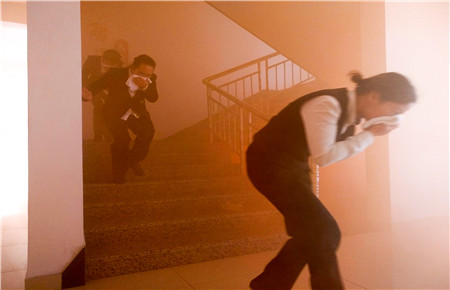 圖為參演人員在火災演練中有序撤離