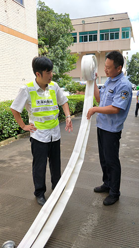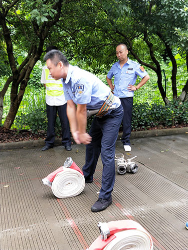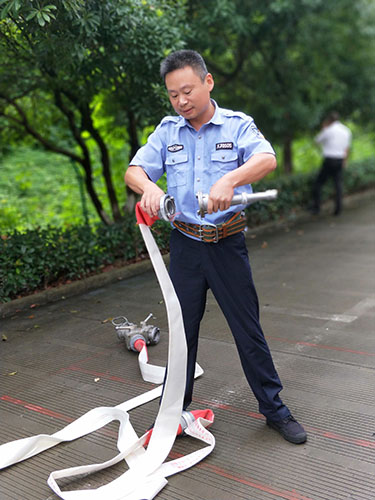 圖為主講人馮常敏操作示范現場 現場,“馮大師”腳下放著兩盤水帶,站姿已成“丁”字步,雙腿微曲,兩拇指與食指握住水帶根部,使虎口以順時針方向對準接口處,做好甩開的準備。“甩第一盤水帶,要運用手腕的力量,要提起水帶并高于地面20到30厘米,再用大臂帶動小臂的力量向前甩出。” “馮大師”耐心地指導。 接下來是兩盤水帶連接的關鍵時候,“馮大師”左右手熟練操作,將如何連接的操作細節一一展現出來,同時邊操作邊說明注意事項,整套動作連貫又迅速,操作一氣呵成,一旁的新人仔細觀摩學習。