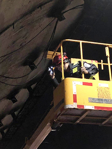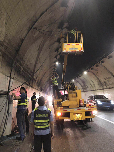 圖為各方人員集聚商討搶修方案 黃土嶺隧道所立即啟動應急搶修預案,聯合高速交警、工程養護部、施救中心展開緊急搶修工作。現場,各方人員集聚商討搶修方案、檢查安全措施、布置搶修作業。登高車上,黃土嶺隧道所執勤二隊隊長林朝波等一批搶修人員率先清理斷落的電纜,調整接線、緊固螺栓……各項工作環環緊扣,緊張而有序。