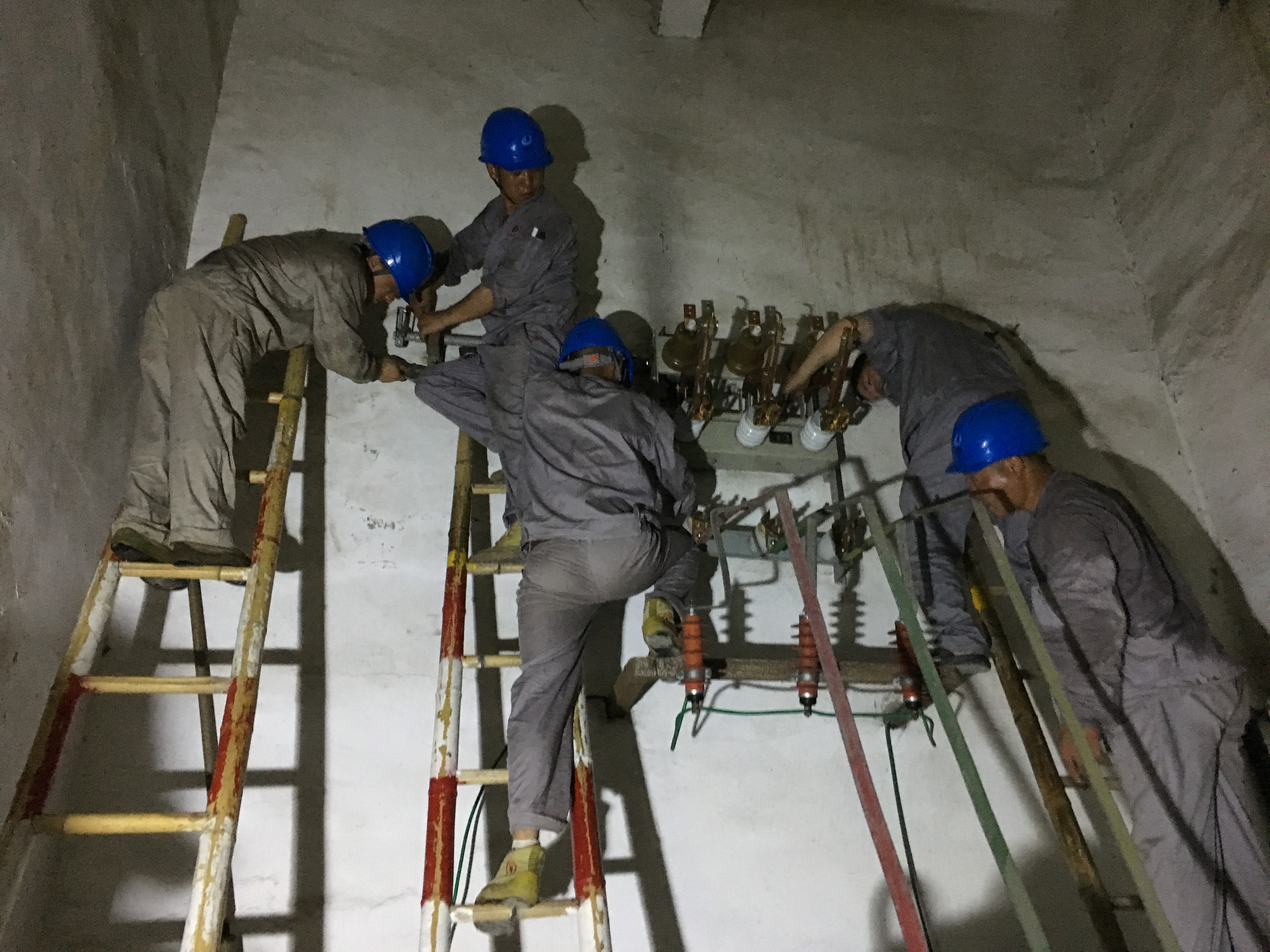 19點40分,高壓負荷開關到位。搶修人員安照各自的分工,掛接地電阻、拆卸舊件、重做高壓電纜接頭、安裝新跌落熔絲......就在大家以為快要完工時,卻發現新開關的聯動拉桿接口要略大于舊桿,任憑搶修人員如何用力都無法與底下操作桿連接,但大家并沒有放棄,而是用磨光機一點點打磨,一次次試驗,在損耗了張磨光片后終于將兩桿順利連接。之后,大家再一鼓作氣,將調試好的負荷開關固定在離地面3米之高墻上,并成功連接電纜。