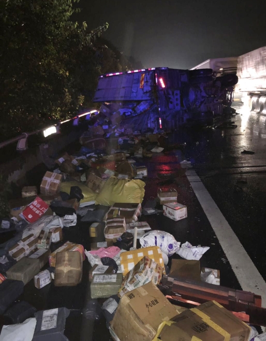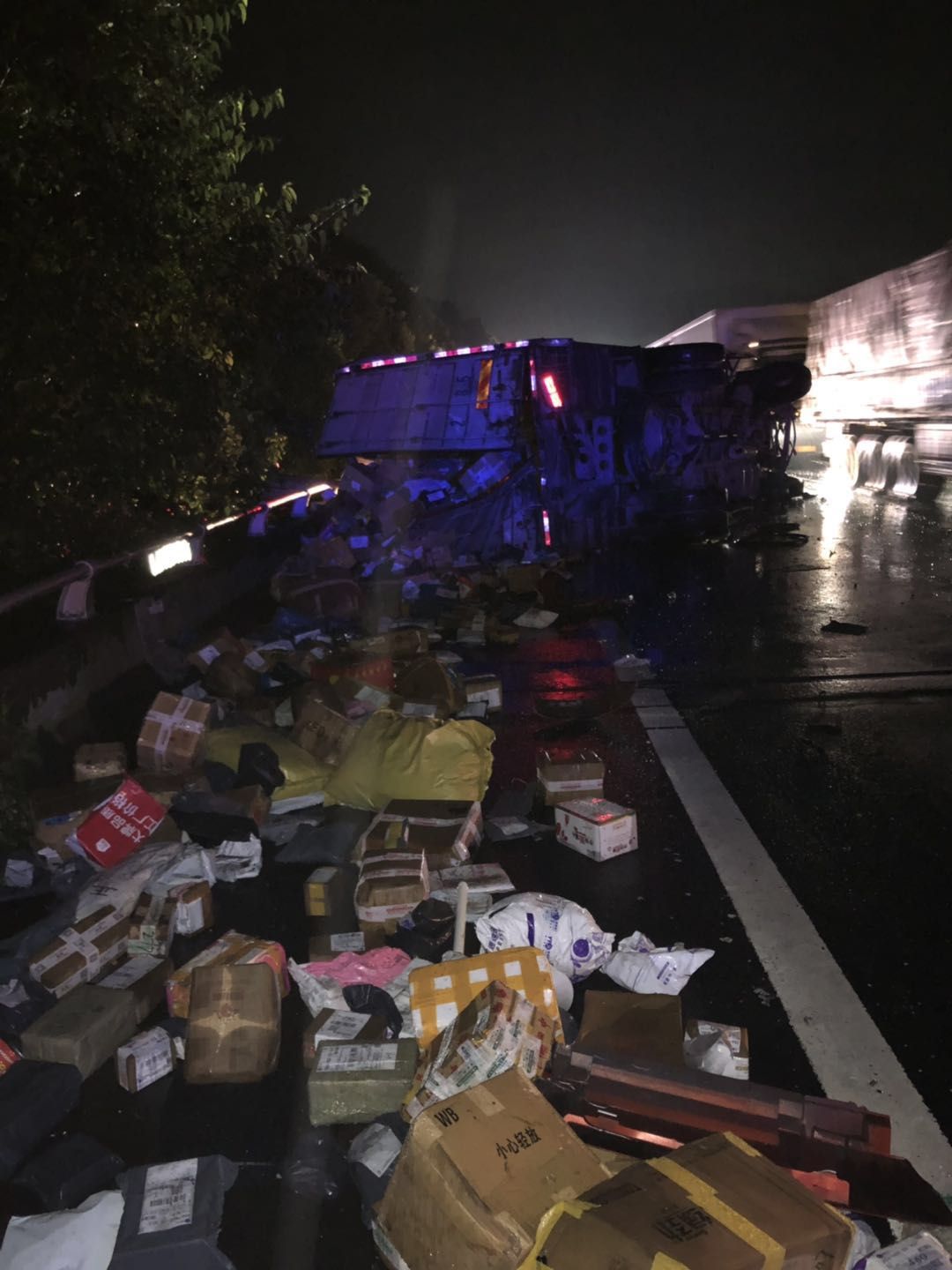 7月14日凌晨1點(diǎn),溫州方向臺州南收費(fèi)所附近,一輛半掛型大貨車和一輛快遞車相撞,半掛車直接沖出高速,四腳朝天。快遞車則是被巨大的沖擊力撞向了硬路肩,側(cè)翻中撒下數(shù)十米的貨物。1點(diǎn)10分,救援車輛到達(dá)現(xiàn)場,現(xiàn)場一片狼藉,防撞護(hù)欄板、護(hù)欄柱損傷嚴(yán)重,橋梁鋼管都折斷了不少。