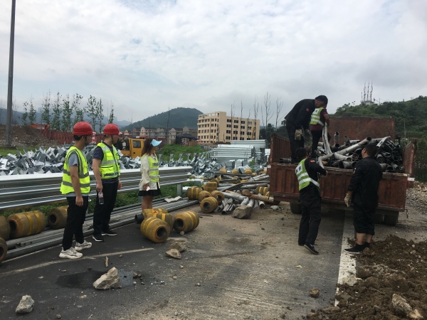公司多部門聯合處置廢舊物資 7月27日,為協助工程部開展6.13浙江溫嶺槽罐車爆炸事故受損路段維修,盡早恢復通行。資產管理部在本月第二次聯合工程部、計財部、監察室對公司路損防撞護欄板及立柱等廢舊物資進行處置。