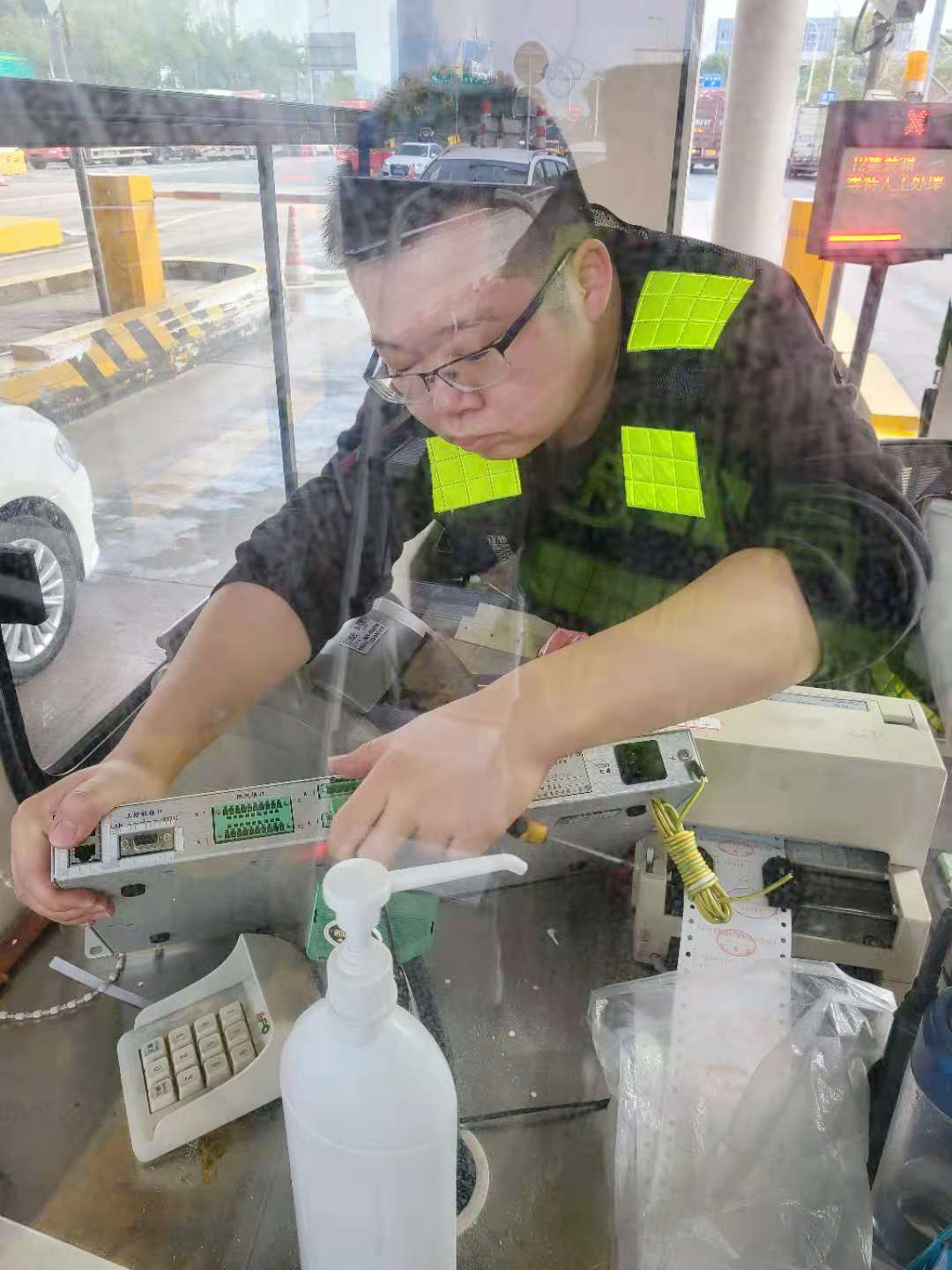 “咦,崗亭桌上的這個扁長形設備哪里去了,忽然感覺桌面整潔了好多!”剛來交班的臺州收費所收費員李靜一臉疑惑,“拿掉了這個設備,ETC車輛還能正常通行嗎?” “不是拿掉了,是我們給它般了個‘新家’而已?!惫こ滩繖C電設備維養中心陳華棟指了指安裝在桌面下方的設備。