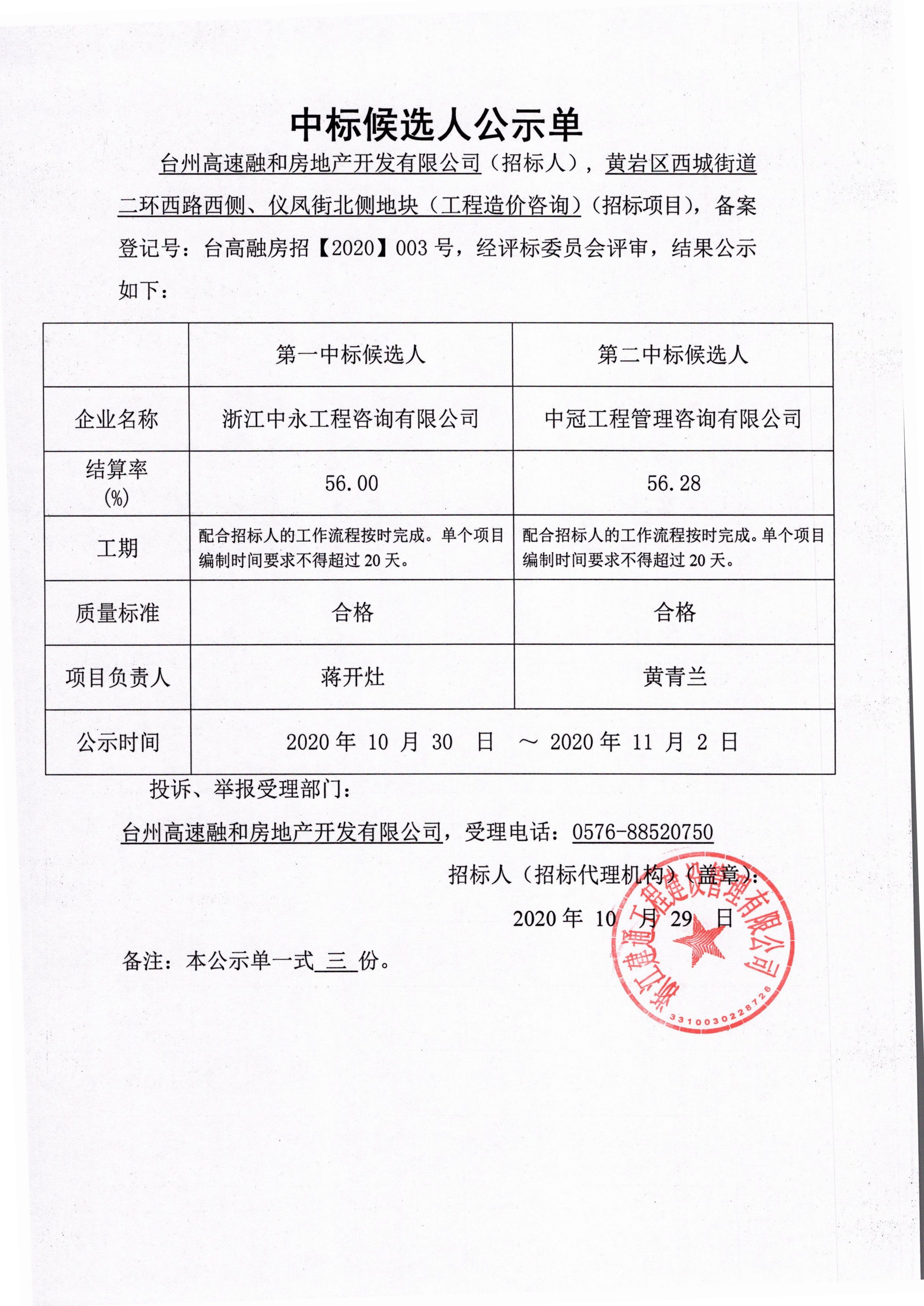 黃巖區西城街道二環西路西側、儀鳳街北側地塊(工程造價咨詢)中標候選人公示單