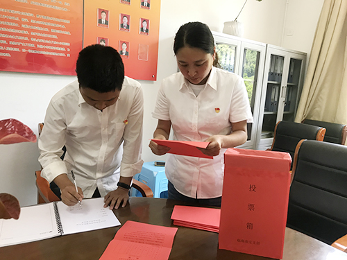 圖為投票現場 會議通過舉手表決方式一致通過了選舉辦法和監票人、計票人名單。本次選舉大會應到正式黨員11名,實到10名。經過計票、監票等程序,以差額無記名方式推選孫明偉、周戰、陳瑩三名同志為新一屆支部委員會委員。在隨后召開的支委會第一次會議上,選舉孫明偉任支部書記,周戰任紀律委員,陳瑩任組織宣傳委員。