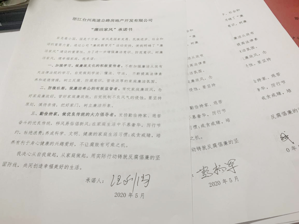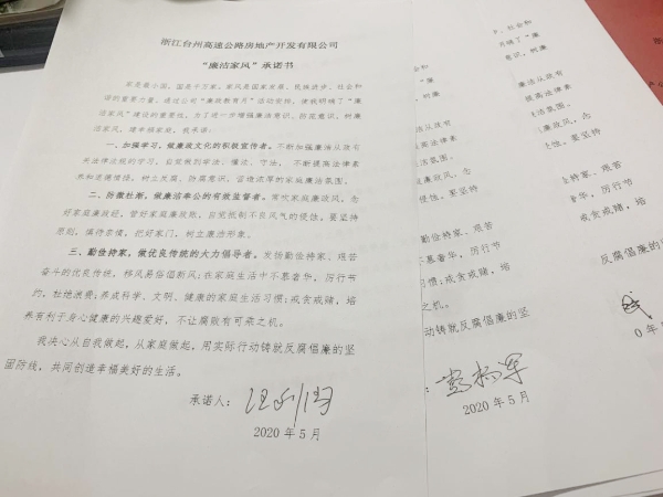 圖為全體黨員觀看廉政教育短視頻《國(guó)畫(huà)》  圖為簽訂“廉潔家風(fēng)”承諾書(shū) 根據(jù)集團(tuán)公司《關(guān)于組織開(kāi)展“廉政教育月”活動(dòng)的通知》文件要求,為推動(dòng)“不忘初心、牢記使命”主題教育常態(tài)化,深入學(xué)習(xí)貫徹黨的十九大和十九屆二中、三中、四中全會(huì)及十九屆中紀(jì)委四次全會(huì)精神,嚴(yán)守黨的政治紀(jì)律和政治規(guī)矩,更好地落實(shí)黨風(fēng)廉政建設(shè)有關(guān)要求,高速房產(chǎn)公司黨支部組織了這次專題活動(dòng)。全體參會(huì)人員一起觀看廉政教育視頻,宣讀“廉潔家風(fēng)”倡議書(shū),簽訂“廉潔家風(fēng)”承諾書(shū),開(kāi)展“廉潔文明家風(fēng),黨員干部示范”大討論。 此次黨風(fēng)廉政專題活動(dòng)進(jìn)一步增強(qiáng)了黨員干部的廉潔意識(shí)、防范意識(shí),起到帶頭正品行、立家規(guī)、嚴(yán)家教、樹(shù)家風(fēng)建設(shè)的表率作用,以好家風(fēng)促黨風(fēng)帶社風(fēng)民風(fēng),為新形勢(shì)下臺(tái)州高速房產(chǎn)事業(yè)貢獻(xiàn)力量。 鄭攀